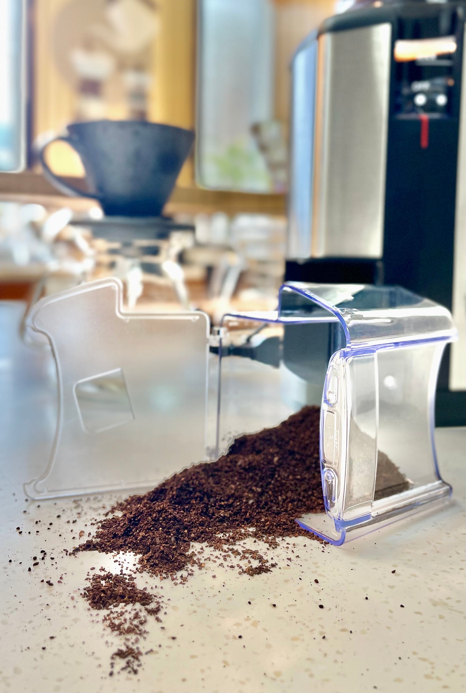 b. Press I/O button to begin grinding coffee. Ground coffee will begin to drop into the removable ground coffee container.