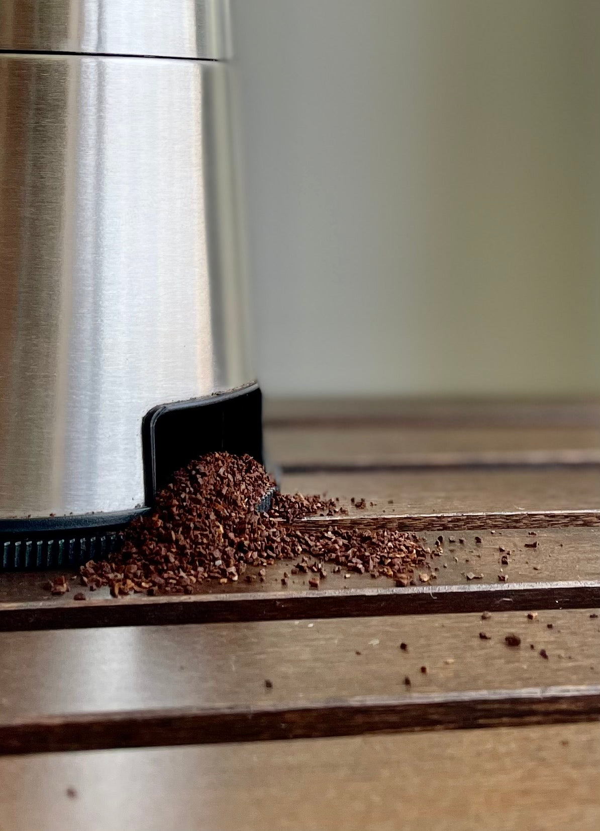 Holding the handy grinder firmly in one hand, grasp the bottom ring with the other hand and turn clockwise with right hand until the coffee ground container door is in the open position. Dispense ground coffee directly into any brewing tool.